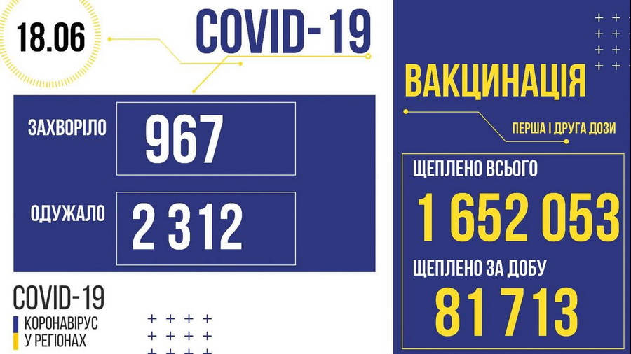 В Україні за добу одужали 2 312 людини. Захворіли – 967. Померли – 50. Вакцинувалися протягом доби 57 970 + 23 743. Загалом проведено 1 652 053 вакцинацій.