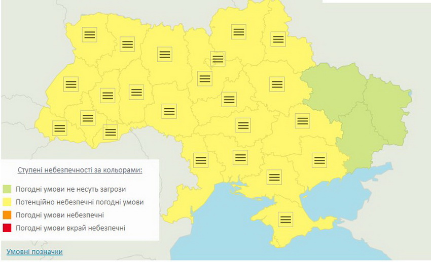 І рівень небезпечності встановлюють, якщо погодні умови потенційно небезпечні для населення, інфраструктури та навколишнього природнього середовища. Рекомендується зберігати підвищену уважність та обережність. Слідкувати за повідомленнями про можливе подальше ускладнення погодних умов.