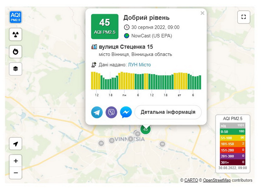 Крім того, за даними SaveEcoBot, рівень забруднення атмосферного повітря у місті Вінниця також у межах норми.