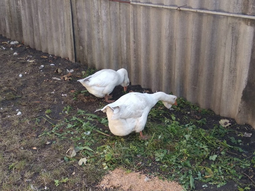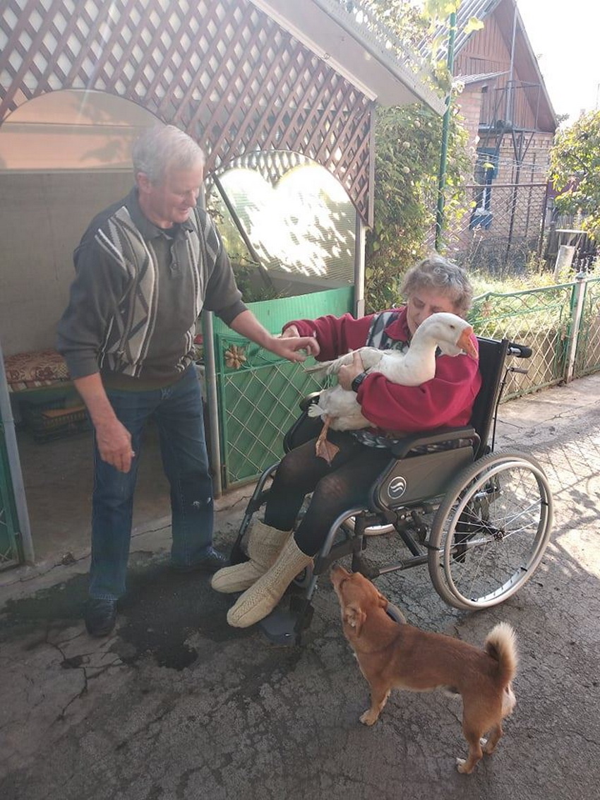 Зазвичай до господарів першим із хліва виходить 25-річний Андрюша, слідом – його обраниця 23-річна Марфуша. Вони не відходять один від одного. Та коли гусака кличе хазяйка, він одразу залазить їй на руки, цілується та ніжно притискається.
