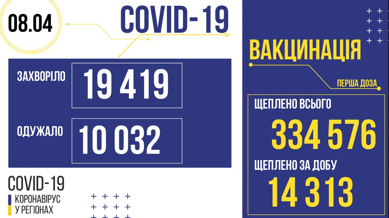 Ситуація з поширенням коронавірусу в Україні погіршується - за минулу добу 19 419 нових випадків інфікувань. Одужали минулої доби 10 032 людини, померли 464 людини. За добу щеплено 14 313 осіб та проведено 128 440 тестувань.