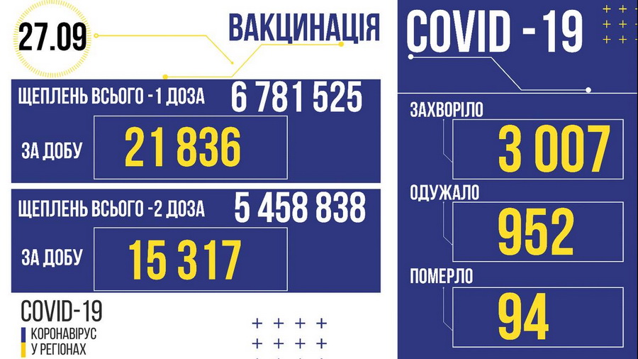 В Україні за добу захворіли -3 007. Одужали – 952 людини. Померли – 94. Госпіталізовано – 1 478. Вакцинувалися протягом доби – 21 836+15 317.
