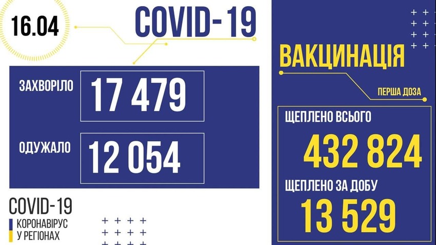 В Україні за минулу добу 17 479 нових випадків інфікувань. Одужали – 12 054 людини, померли 438 пацієнтів. За минулу добу щеплено 13 529 осіб.