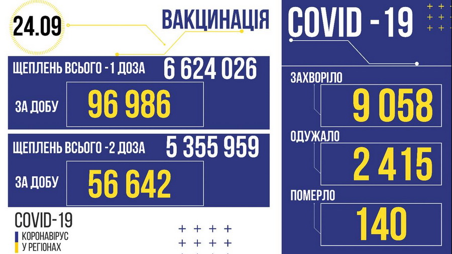 В Україні за добу захворіли - 9058 . Одужали – 2415 людей. Померли – 140. Госпіталізовано – 2 060. Вакцинувалися протягом доби – 96 986+ 56 642.