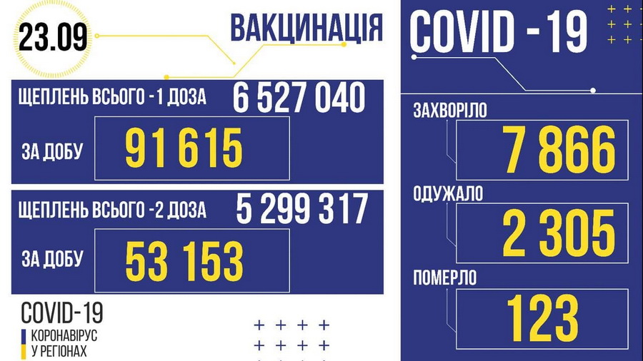 В Україні за добу захворіли – 7 866. Одужали – 2 305 людей. Померли – 123. Госпіталізовано – 2 070. Вакцинувалися протягом доби – 91 615 + 53 153.