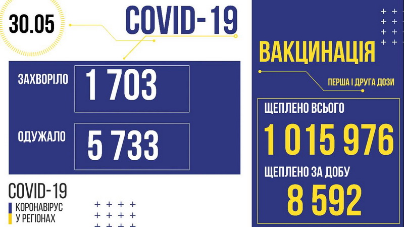 В Україні за добу одужали 5 733 людини. Захворіли – 1 703. Померли – 84. Щеплено – 7 119. Загалом проведено 1 015 976 вакцинацій.