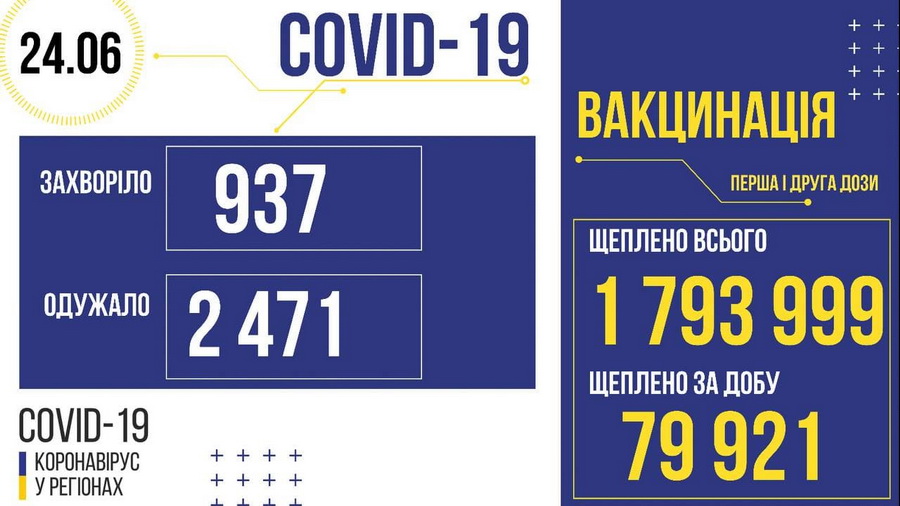 В Україні за добу одужали 2 471 людей. Захворіли – 937. Померли – 58. Вакцинувалися протягом доби 38 862 + 41 059. Загалом проведено 1 793 999 вакцинацій.