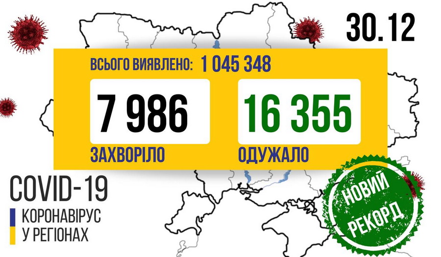Станом на ранок 30 грудня на Вінниччині зафіксували 164 нових випадків захворювання на коронавірус за добу (29.12 було 70). Загалом по Україні 7 986 нових випадків. Внаслідок ускладнень, викликаних хворобою, минулої доби в Україні померли 243 пацієнта. Одужали за минулу добу – 16 355. Це новий рекорд одужавших за добу.
