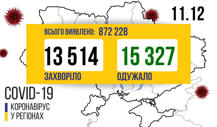 Станом на ранок 11 грудня на Вінниччині зафіксували 275 нових випадків захворювання на коронавірус за добу (10.12 було 218). Загалом по Україні – 13 514 нових випадків. Внаслідок ускладнень, викликаних хворобою, минулої доби в Україні померли 285 пацієнтів (з початку епідемії померли 14 755 людей). Одужали за минулу добу – 15 327 осіб.