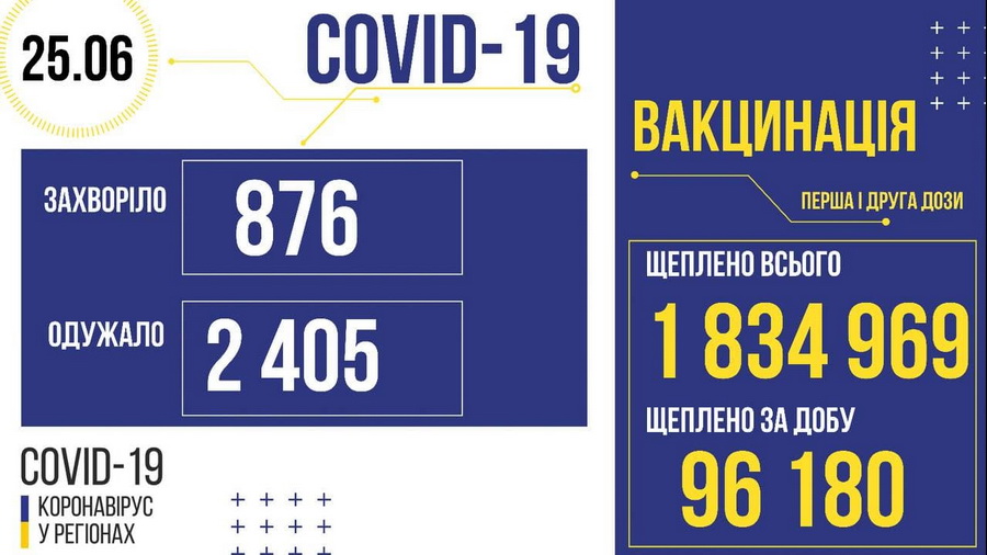 В Україні за добу одужали 2 405 людей. Захворіли – 876. Померли – 53. Вакцинувалися протягом доби 40 970 + 55 210. Загалом проведено 1 834 969 вакцинацій.