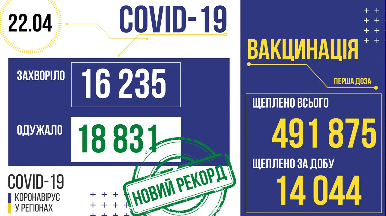 В Україні рекордна кількість одужавших - 18 831 людей. За минулу добу 16 235 нових випадків інфікувань. Померли 470 пацієнтів. За минулу добу щеплено 14 044 осіб.