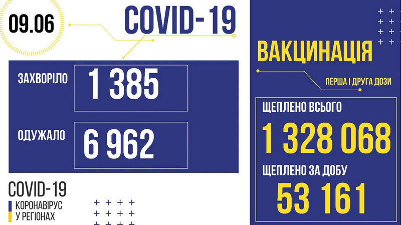 В Україні за добу одужали 6 962 людини. Захворіли – 1 385. Померли – 77. Щеплено – 43 925. Загалом проведено 1 328 068 вакцинацій.