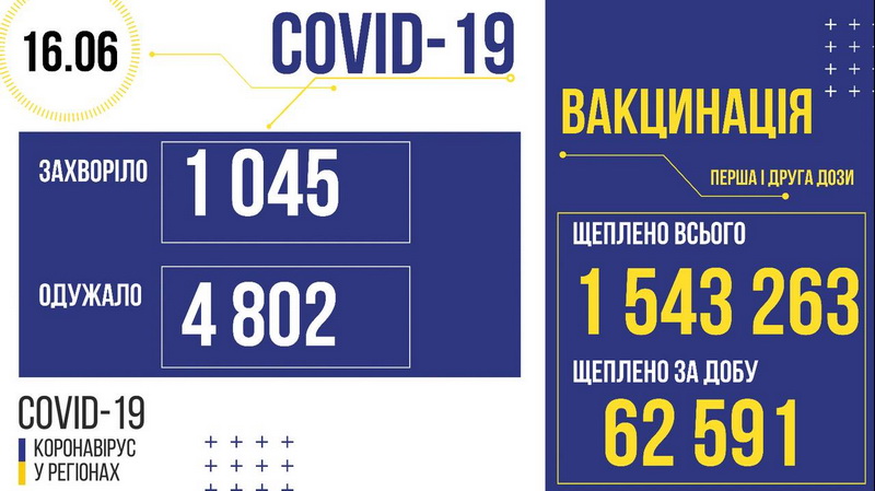 В Україні за добу одужали 4 802 людини. Захворіли – 1 045. Померли – 78. Загалом проведено 1 543 263 вакцинацій.