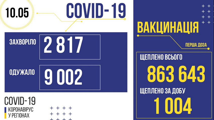 Загалом в Україні за добу одужали 9 002 людей. Захворіло - 2 817. Померли - 119. Щеплено — 1 004, а загалом проведено 863 643 вакцинації.