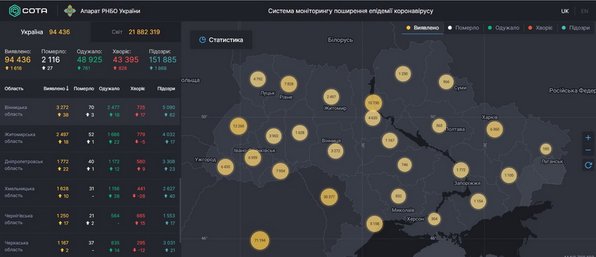 Загалом, в Україні від початку епідемії захворіли 94 436 громадян. За минулу добу хворобу підтвердили у 1 616 випадках. Одужали 48 925 пацієнтів. За останню добу – 761. Померли від хвороби – 2 116. За останню добу – 27.