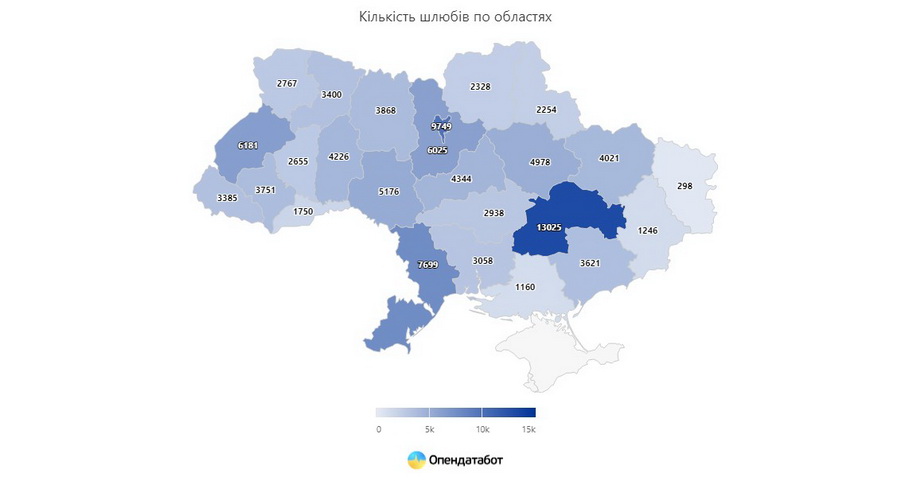 За кількістю одружень лідує прифронтова Дніпропетровська область – за цей період в регіоні було зареєстровано 13 025 родин. Зростання кількості нових сімей спостерігається в усіх тилових областях – окрім Чернівецької. Там від початку року кількість шлюбів знизилась на 11% у порівнянні з відповідним періодом тогоріч.