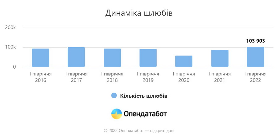 За перші 6 місяців 2022 року в Україні зареєстрували рекордну кількість шлюбів – 103 903 пар. Це на 21% більше, аніж за той самий період у 2021 та абсолютний рекорд за останні 7 років. У Вінницькій області одружилися 5 176 пар.