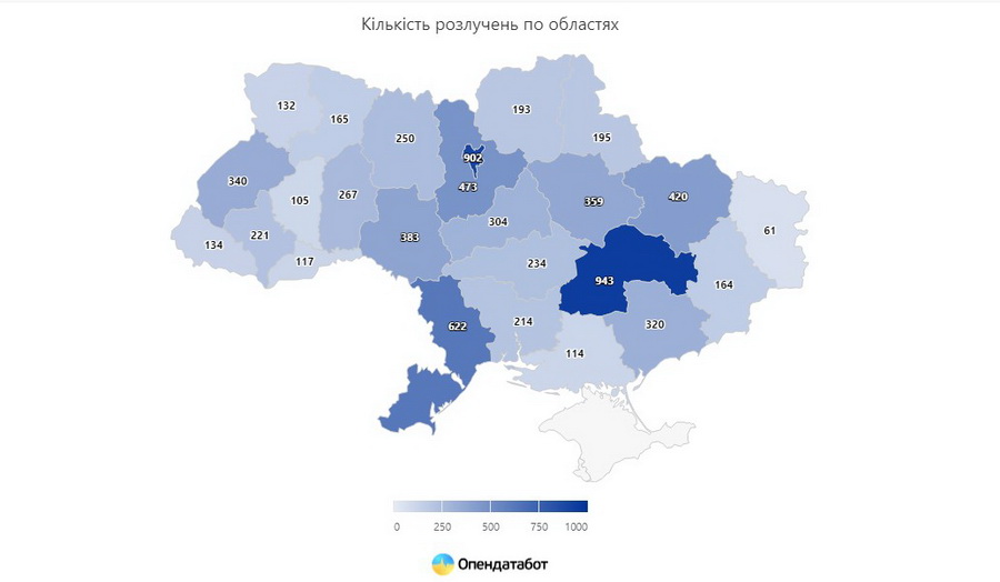 Лідером за кількістю розлучень так само, як й за кількістю шлюбів, стала Дніпропетровська область – 943 розлучення. У Вінницькій області за перші півроку розлучилися 383 пари.