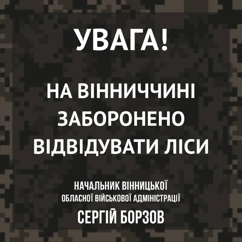 На Вінниччині заборонили відвідувати ліси. Це пов'язано з реальною загрозою виникнення пожеж у лісах та мінімізації їх наслідків. Відповідний наказ «Про встановлення заборони на відвідування лісів населенням» 28 березня підписав голова Вінницької обласної військово-цивільної адміністрації Сергій Борзов.