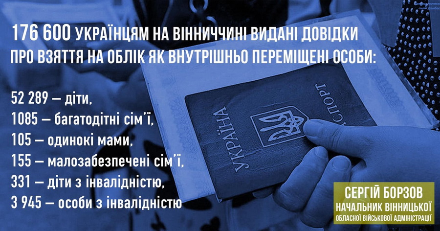 Станом на 13 червня у Вінницькій області на постійному проживанні перебуває 176 тисяч 782 внутрішньо переміщених особи, з них 1433 особи – маломобільні, 52 289 осіб  – діти.