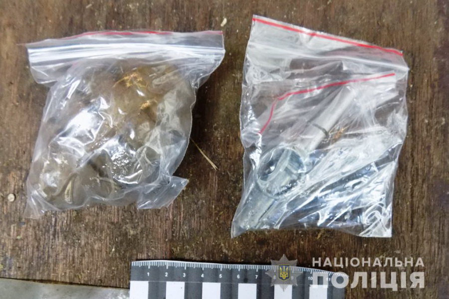 Під час огляду місця події та автомобіля, на якому пересувались зловмисники, працівники поліції вилучили пакет з наркотиками, електронні ваги, гранату Ф-1 та запал до неї.