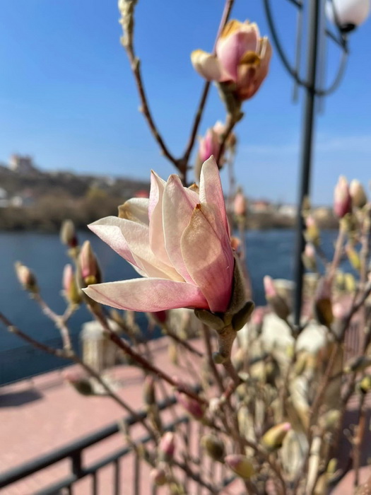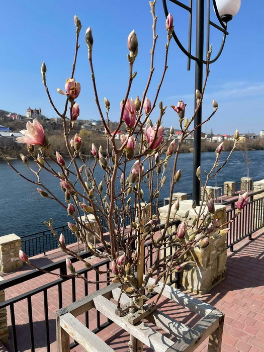 Наприкінці березня, у прикордонному місті Могилів-Подільський, що на Вінниччині, почала цвісти магнолія. Це помітили місцеві жителі, коли проходили набережною Дністра, який розділяє рубежі України та Молдови. Там кілька років тому висадили молоді дерева. Фотографії ніжно-рожевих бутонів виклали у соціальні мережі.