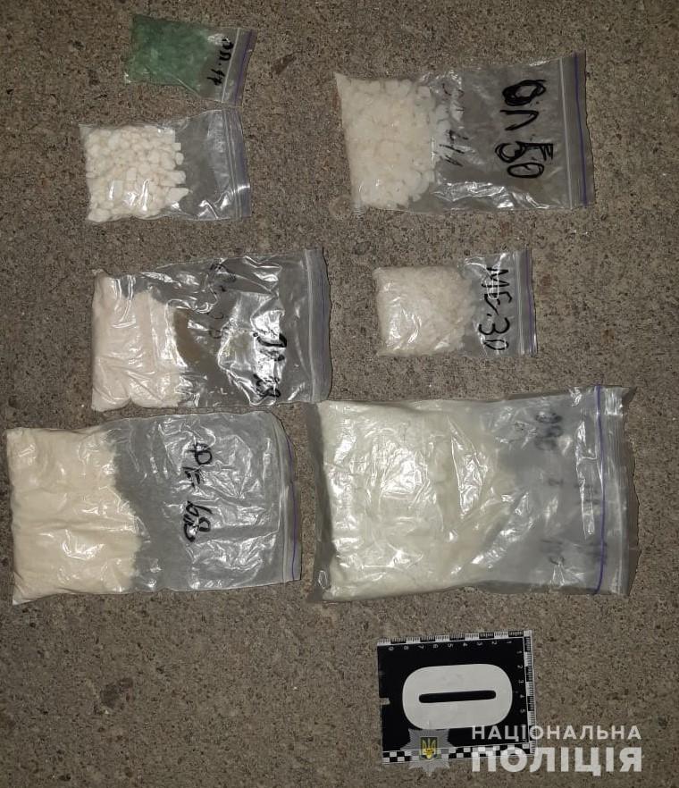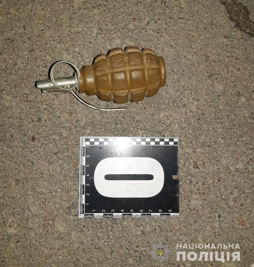На місці події вибухотехніки та слідчо-оперативна група поліції вилучили бойову гранату Ф-1, ручну димову гранату та пакети з амфетаміном.