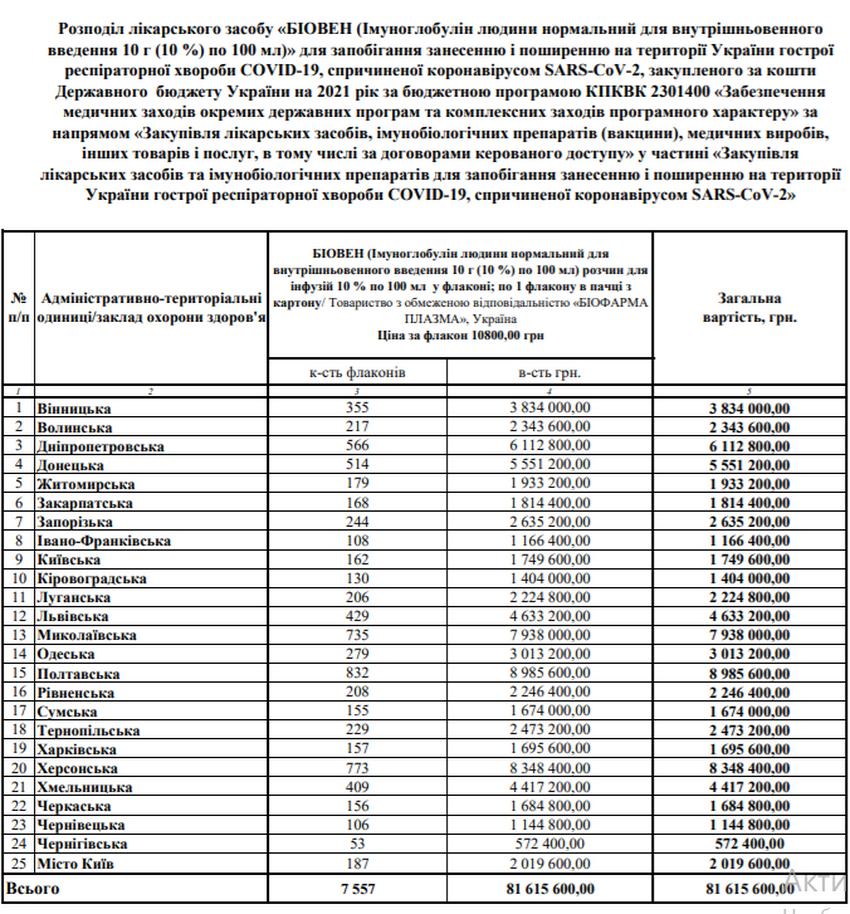 За розподілом, Вінницька область отримає 355 флаконів «БІОВЕН» (Імуноглобулін людини нормальний для внутрішньовенного введення 10 г (10 %) по 100 мл).