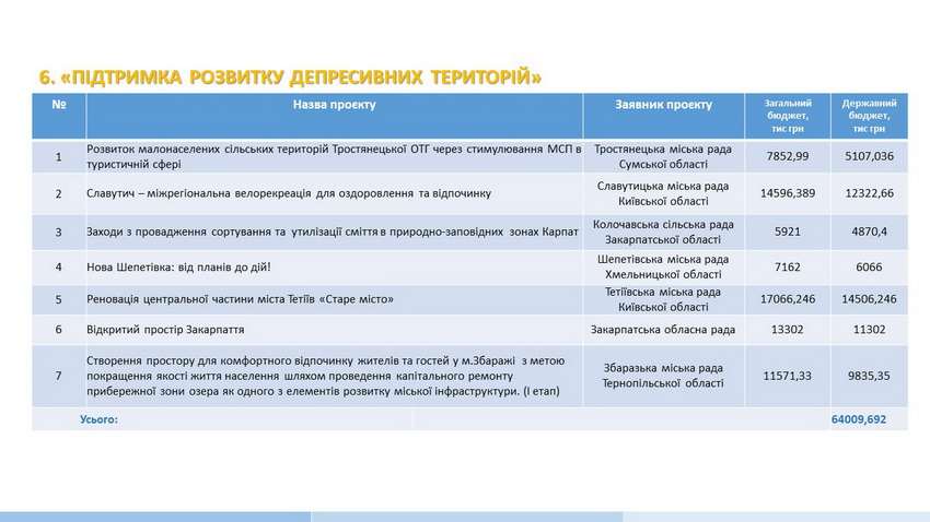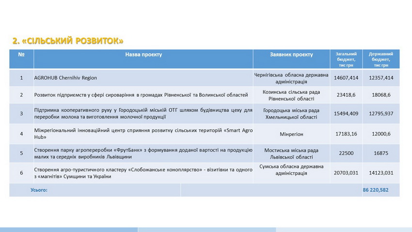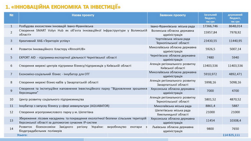 Під час першого конкурсного відбору відібрали 70 проектів за 5 напрямками на суму понад 616 млн грн.