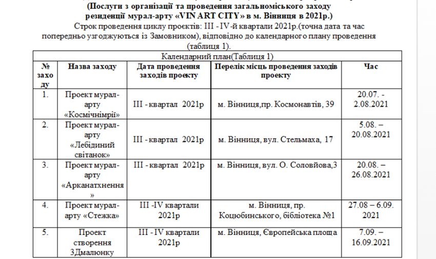 Комунальний заклад Вінницької міської ради «Центр концертних та фестивальних програм» оголосив тендер на закупівлю послуг з організації та проведення загальноміського заходу резиденції мурал-арту «VIN ART CITY». Очікувана вартість закупівлі – 283 тисячі гривень.