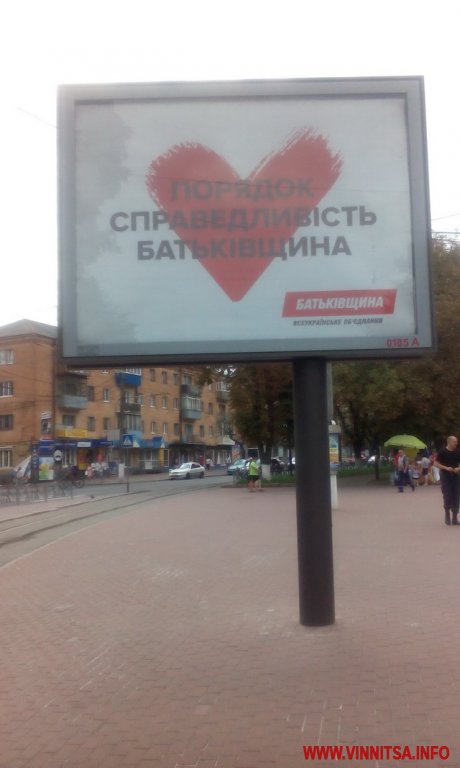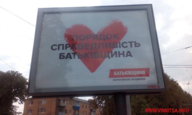 З’явились білборди вже і всеукраїнського об’єднання «Батьківщина». На сайті партії вказано, що керує регіональним осередком у Вінниці Людмила Щербаківська.
