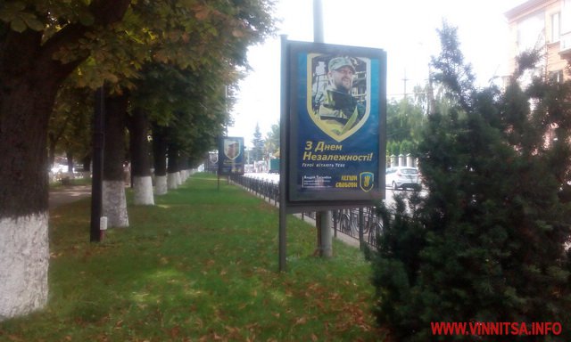 Нещодавно партія «Свобода» розмістила білборди та сіті-лайти, на яких військові вітають вінничан з Днем незалежності. Поки що партія розмістила по місту найбільше реклами, ніж її конкуренти. Очолює вінницьку «Свободу» Олексій Фурман.