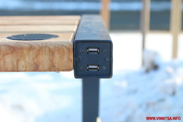 Також у залізний каркас вбудовані USB-входи – по два з кожної сторони. Вони призначені для підзарядки мобільних телефонів, планшетів та інших гаджетів. Є також бездротовий зарядний пристрій круглої форми.
