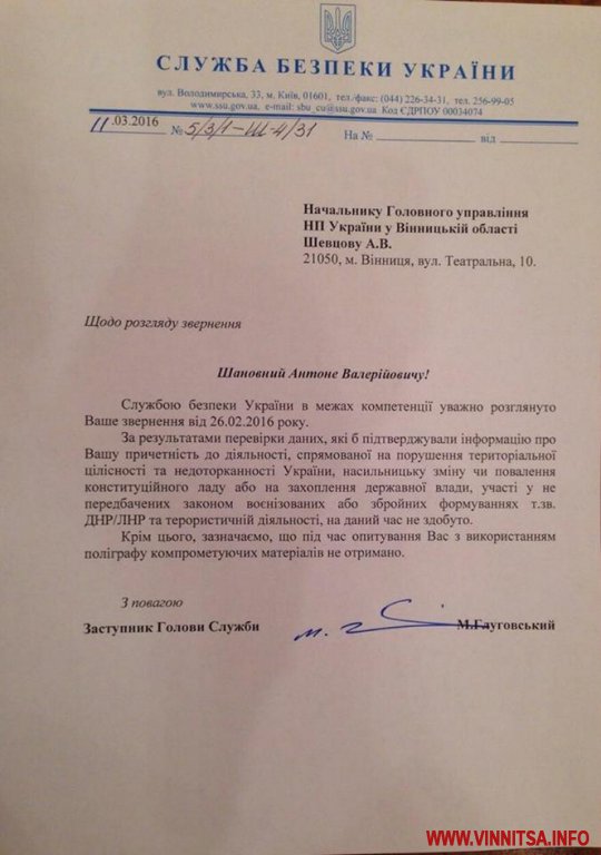14 березня начальник ГУ НП Вінниччини Антон Шевцов опублікував на власній сторінці у соцмережі офіційні результати щодо перевірки його на причетність до сепаратизму.