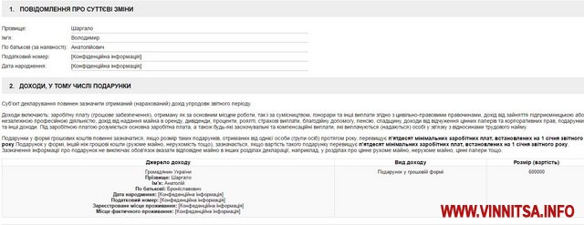 Володимир Шаргало, який працює начальником слідчого відділу прокуратури Вінницької області задекларував подарунок у грошовій формі в розмірі 600 тисяч.