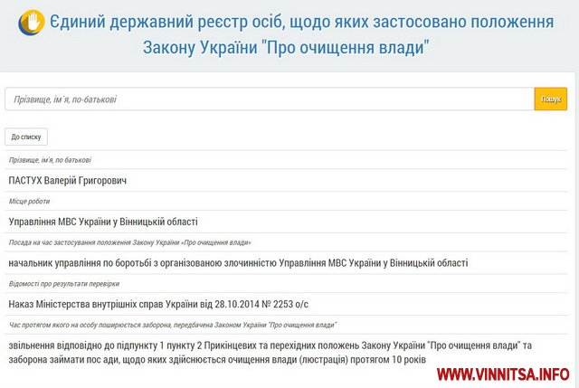 У відкритому списку чиновників, які підлягають звільненню відповідно до закону Про очищення влади, на сайті Мінюсту з’явилось прізвище начальника УБОЗ у Вінницькій області, полковника міліції Валерія Пастуха.