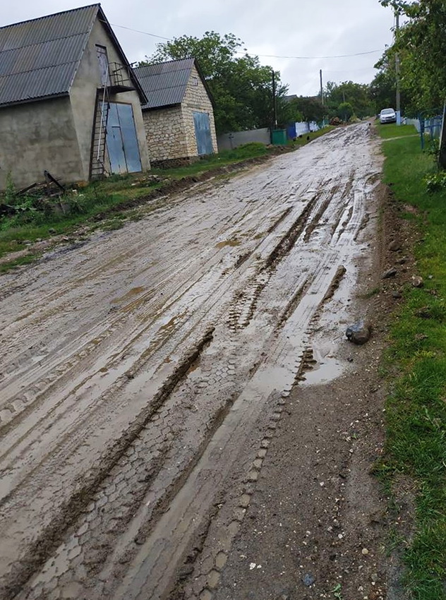Вчора на вулицю вантажні автомобілі почали звозити чорнозем та глину. Землю висипали на узбіччі вулиці, після чого її розгорнув трактор. Дощ зробив з дорожнього покриття болото, в якому почали застрявати автомобілі.
