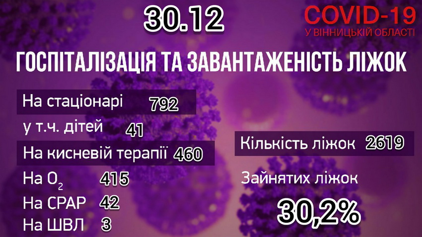 За інформацією Департаменту охорони здоров’я та реабілітації ОДА, в 25 опорних лікарнях області, станом на ранок 30 грудня, на стаціонарі із підтвердженим COVID-19 перебуває 393 дорослих та 6 дітей, з підозрою на коронавірус – 358 дорослих та 35 дітей. На апараті ШВЛ – 3 пацієнта, СРАР - 42, кисень – 415. На даний час розгорнуто 2 619 ліжок.