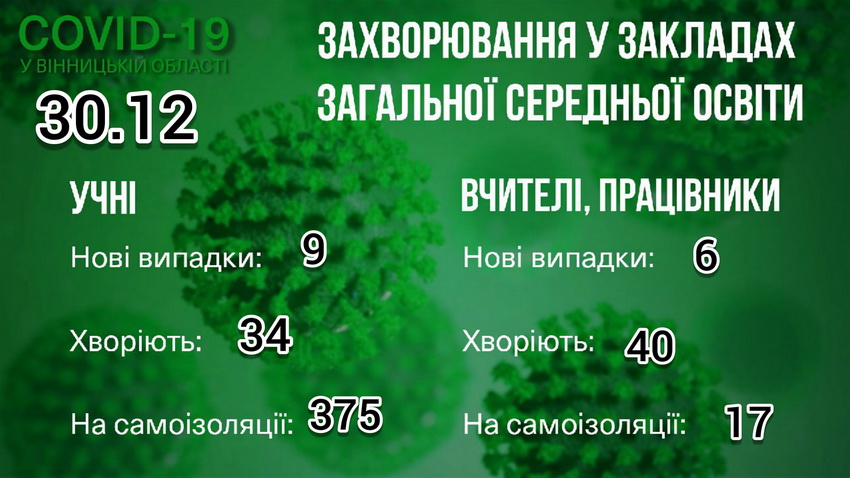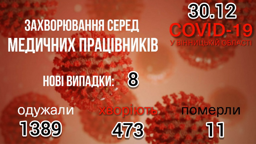 За інформацією Вінницької ОДА, станом на ранок 30 грудня, на Вінниччині виявили 163 нові випадки захворювання на коронавірус. Повторно захворіли 10 людей. Внаслідок ускладнень, викликаних хворобою, померли 7 пацієнтів. За добу захворювання виявили у 8 медичних працівників.