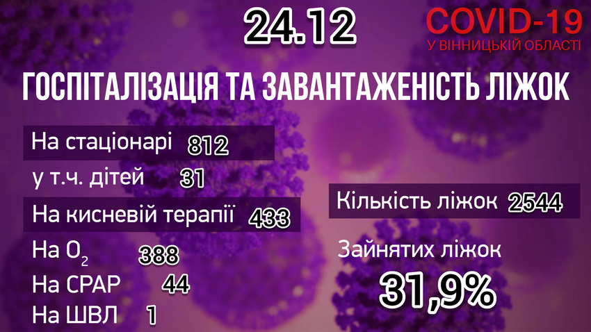 За інформацією Департаменту охорони здоров’я та реабілітації ОДА, в 25 опорних лікарнях області, станом на ранок 24 грудня, на стаціонарі із підтвердженим COVID-19 перебуває 391 дорослий та 2 дітей, з підозрою на коронавірус – 390 дорослих та 29 дітей. На апараті ШВЛ – 1 пацієнт, СРАР – 44, кисень – 388. На даний час розгорнуто 2 544 ліжка.