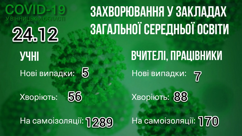 За інформацією Вінницької облдержадміністрації, станом на 23 грудня на Вінниччині виявили 231 новий випадок захворювання на коронавірус. Повторно COVID-19 виявили у 4 людей. Внаслідок ускладнень, викликаних хворобою, напередодні померли 4 пацієнтів. За добу захворювання виявили у 19 медичних працівників.