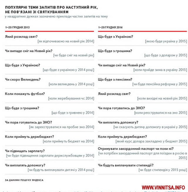 Люди цікавляться не лише зустріччю нового року, а й тим, що від нього чекати. Наприклад: «какие изменения в пенсионной реформе в 2015», «що буде з доларом у 2015 році».