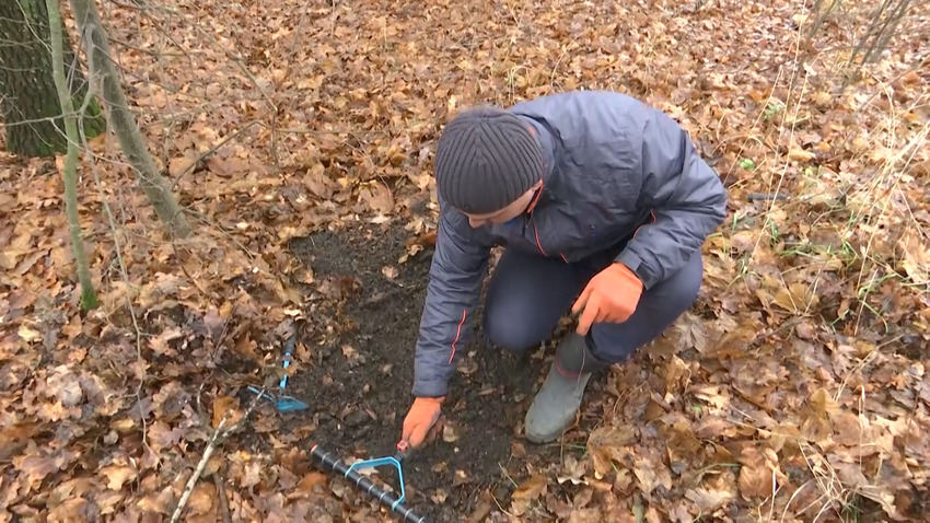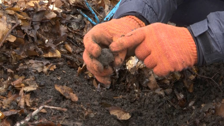 “Тут є білий трюфель. Зараз вже не сезон, але, так, як зима тепла, то білий трюфель ще наростає. Зазвичай, він росте на одному місті. Треба його запам'ятати. Невеличкими граблями зачищаю територію від листя та гілочок. А потім можна побачити такий білий наліт. Ну, значить і можна копати”, - розчищає територію та починає копати.