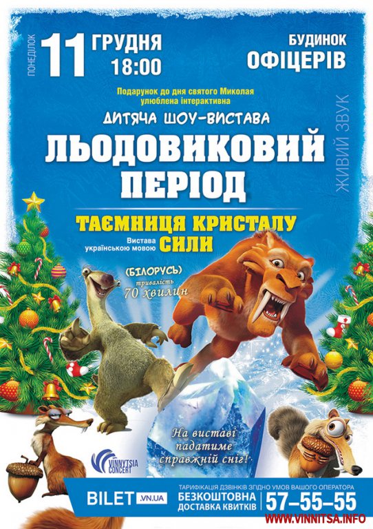 Напередодні довгоочікуваного і улюбленого Дня святого Миколая герої улюбленого мультфільму: шаблезубий тигр Дієго, лінивець Сід, мамонт Менні й шалені Білки – чекатимуть всіх вінницьких діток на незабутній шоу-виставі ««Льодовиковий період»!