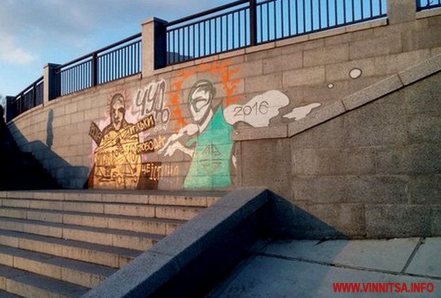 На графіті також зображені слова: «воля», «чудо», фраза – «тільки свобода – це істина», двічі повторюється цифра 16.