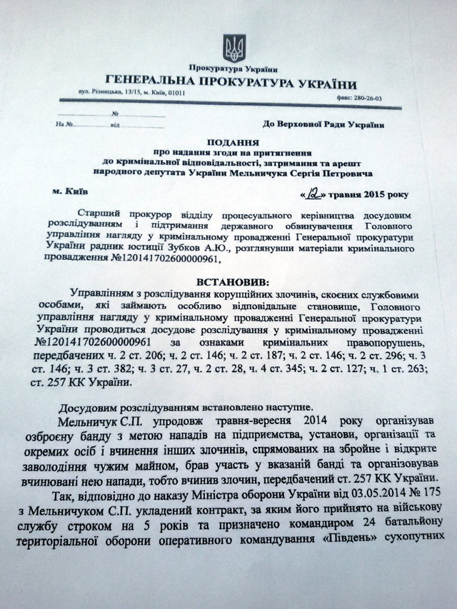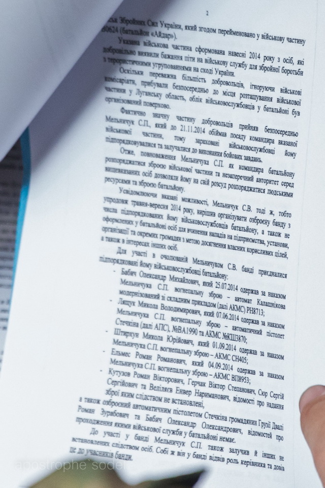 У ньому наводяться факти протиправних дій, які, за відомостями ГПУ, Мельничук здійснював будучи комбатом «Айдару».