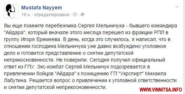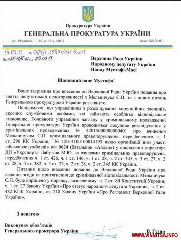 Вирішується питання про притягнення Мельничука до кримінальної відповідальності й зняття з колишнього комбата депутатської недоторканності, йдеться у документі, оприлюдненому Мустафою Найємом у Facebook.