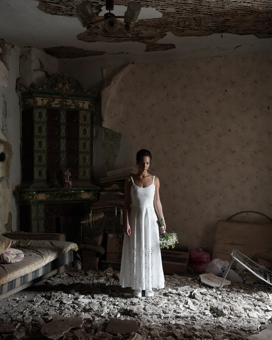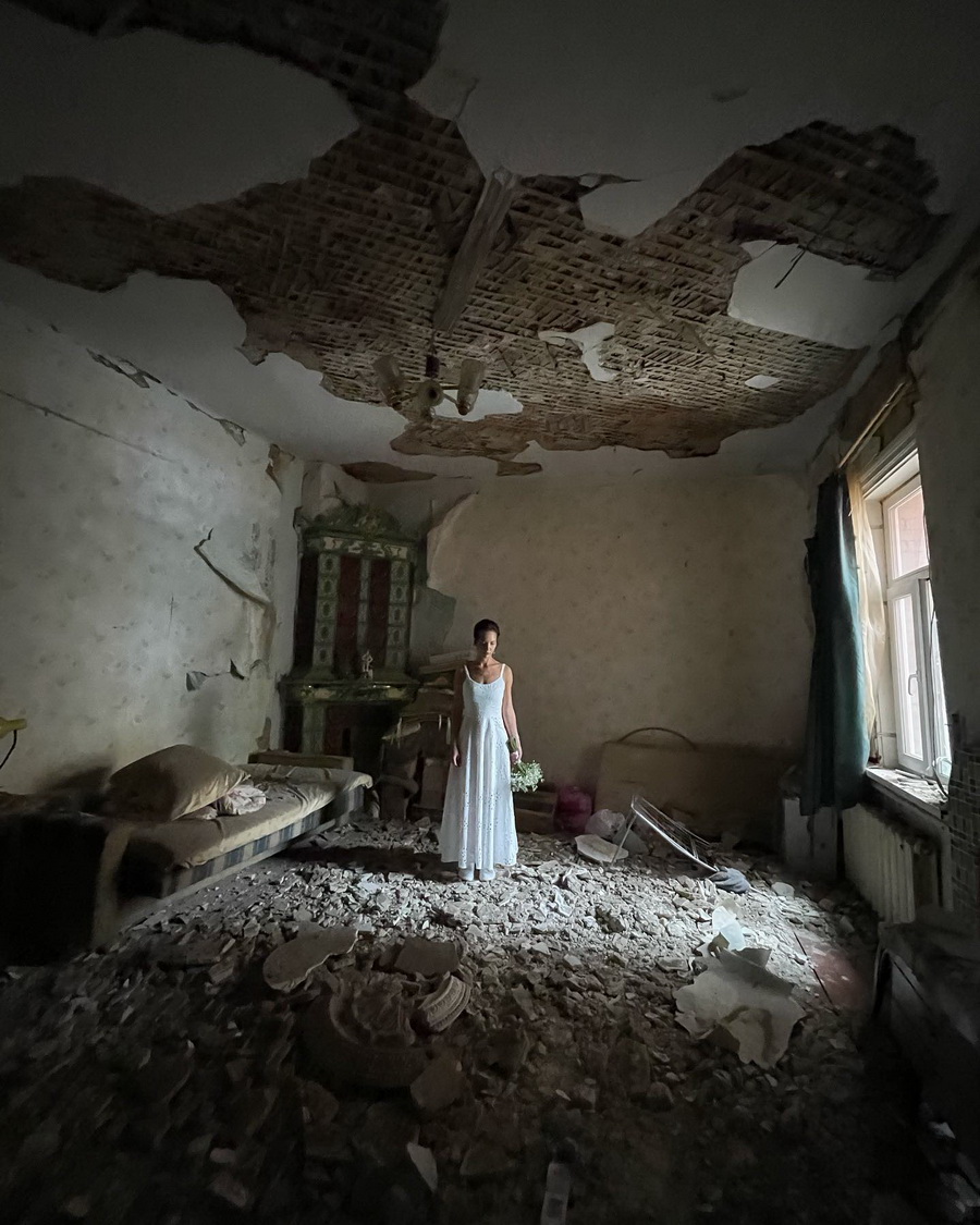 «Коли я зайшов у двір, то побачив зруйновані поруч стріхи будівель та вибиті в цілому кварталі вікна. Фотосесія планувалась інша, але так, як ситуація диктує свої умови, ми вирішили їх висвітлити, адже це реальність. Словами це не передати. Очі розбігались, і я навіть боявся собі уявити, що це міг бути мій будинок. Я не казав Даші, як позувати й що робити. Фото і так кричали без того», – ділиться своїми спогади фотограф Олександр.