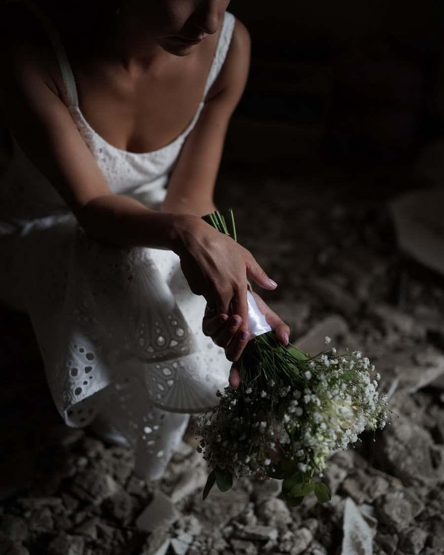 За кілька днів після удару російських ракет, Дар’я та її наречений прийшли до квартири. Дістатись туди було не просто, адже на місці були військові, поліція та експерти. У нареченої Даші попросили прописку, і їх разом з фотографом пустили.