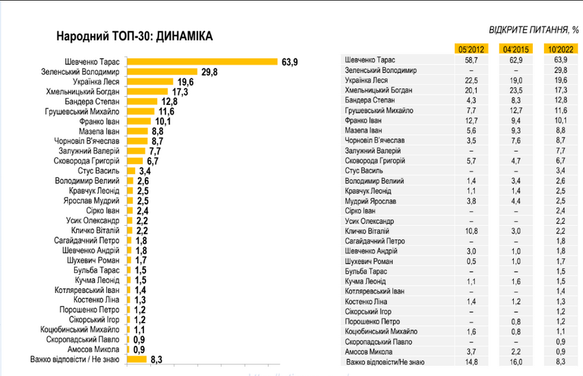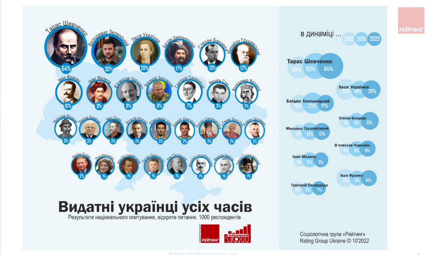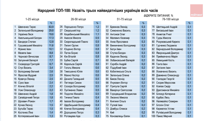 У межах проекту «Народний ТОП» соціологічна група «Рейтинг» продовжила дослідження видатних українців усіх часів. За допомогою відкритого питання респонденти, не отримуючи жодних списків чи підказок, називали імена відомих особистостей, котрих вони вважають достойними цього рейтингу.